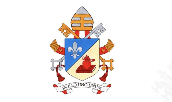 Beneath the shield runs a scroll displaying the pope’s episcopal motto: “In illo uno unum” (“In the one Christ we are one”), a phrase taken from St. Augustine’s commentary on Psalm 127. The motto reflects Leo’s roots in the Augustinian order and his commitment to unity in the Church.