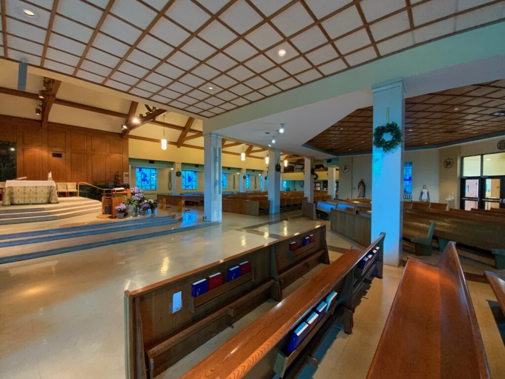 St. Joseph’s Church in Crescent Springs, KY, presents a case study in redemptive transformation of a sanctuary. Originally dedicated in 1960, St. Joseph’s Church was significantly remodeled in 1981 and 1994 in campaigns driven by the need to increase seating. The condition in 2024 was discordant, liturgically ill-fitting, and dated. The sanctuary had two walls: the north sanctuary wall (behind the altar), and the east sanctuary side wall (to the right of the altar when viewed from the nave). The west sanctuary wall (left side) had been removed to accommodate the addition of a “secondary nave” creating an “L” shape, and later a tertiary, wedge-shaped middle section was added to expand and connect the seating areas. The three sections and the differing ceiling heights and materials converge around the sanctuary.