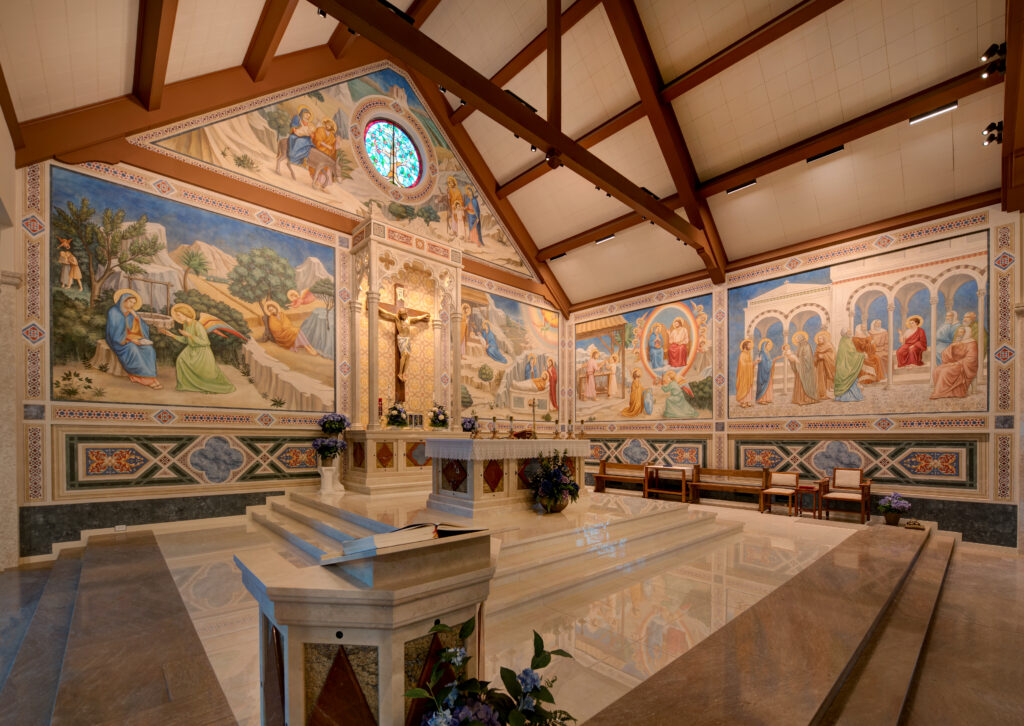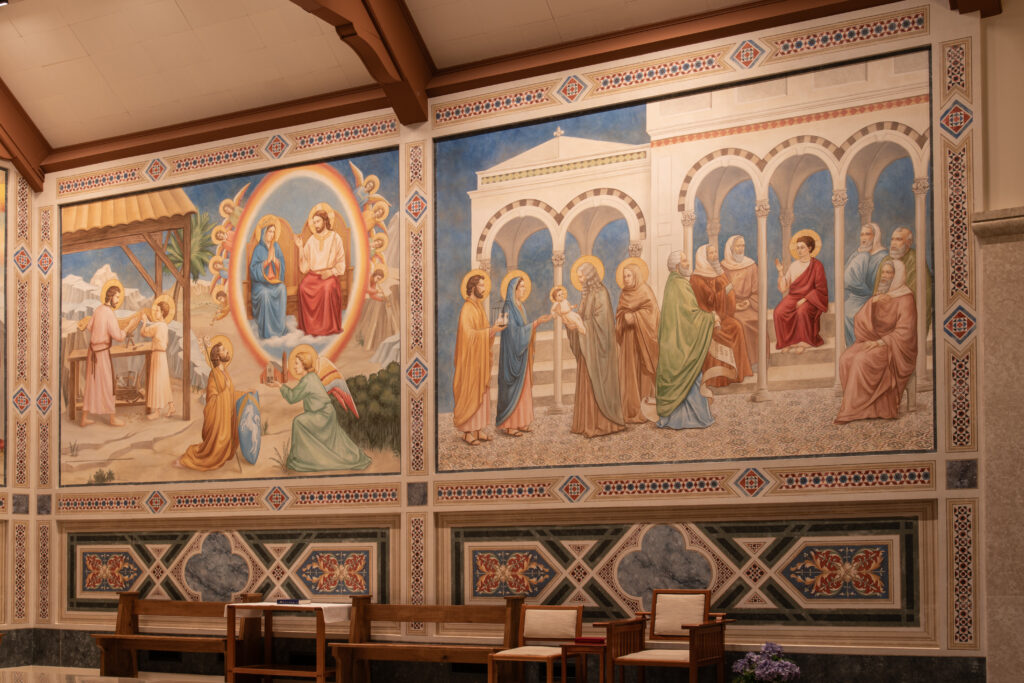 The most striking change is the new mural cycle of the life of St. Joseph which graces the walls, inspired by Giotto di Bondone and Blessed Fra Angelico. Every inch of the sanctuary walls now participates in a liturgical artistry program with manifold functions: support of the liturgy and architecture, catechetical instruction, and vibrant decoration: