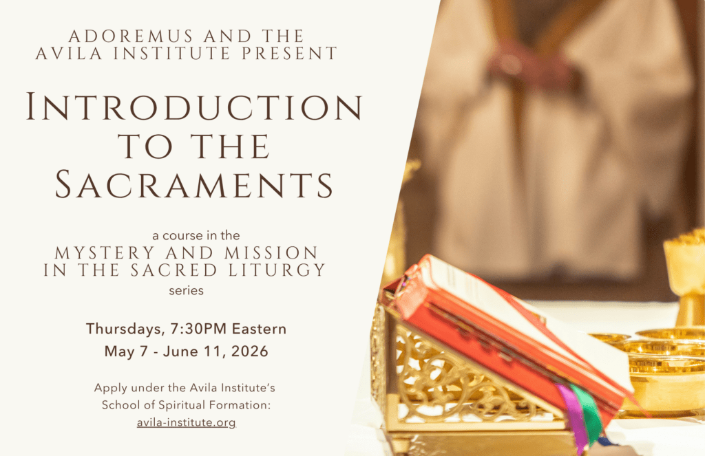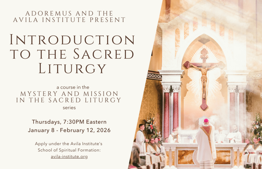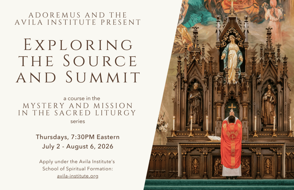 Adoremus joins the Avila Institute in offering “Mystery and Mission in the Sacred Liturgy,” a series of four introductory courses on liturgical prayer and the sacraments, taught by Adoremus director Christopher Carstens; Adoremus contributor and adjunct professor of theology at the University of St. Thomas School of Theology at St. Mary’s Seminary, Houston, TX, and the University of Dallas, Roland Millare; and Adoremus Bulletin editor and associate professor at Sacred Heart Seminary and School of Theology, Hales Corners, WI, Mike Brummond. Adoremus readers will receive a 25% discount and can take each course for only $150. Anyone interested in participating should apply at the Avila Institute for Spiritual Formation (see avila-institute.org/mystery-and-mission-in-the-sacred-liturgy) and enter the discount code ADOREMUS to waive the application fee. Once a participant has been accepted for the course, a representative from the Avila Institute will follow up by assisting in enrollment, which includes processing the 25% discount. Consider joining us!